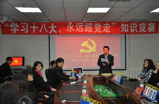 2013年3月12日,公司黨委舉辦“學習十八大,永遠跟黨走”知識競賽。集團旗下天興投資黨總支、商業(yè)投資管理公司黨總支、職工安置中心黨總支、酒店投資管理公司和天興百盛公司黨總支共選派15名黨員參加比賽。天興投資公司黨總支和天興百盛公司分別獲得冠、亞軍。