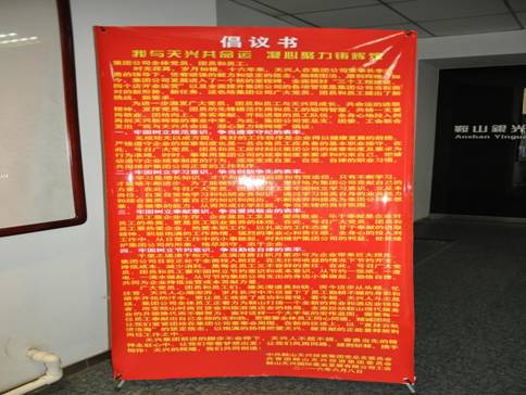 2016年6月2日,由中共鞍山天興投資集團黨總支委員會、共青團鞍山天興投資集團委員會、鞍山天興國際置業(yè)發(fā)展有限公司工會聯(lián)合向集團公司員工發(fā)出《我與天興共命運、凝心聚力鑄輝煌》倡議書。倡議書主要內(nèi)容是牢固樹立“四表率”,即:一是牢固樹立規(guī)范意識,爭當(dāng)遵章守紀(jì)的表率;二是牢固樹立學(xué)習(xí)意識,爭當(dāng)創(chuàng)新爭先的表率;三是牢固樹立奉獻意識,爭當(dāng)愛崗敬業(yè)的表率;四是牢固樹立節(jié)約意識,爭當(dāng)勤儉自律的表率。